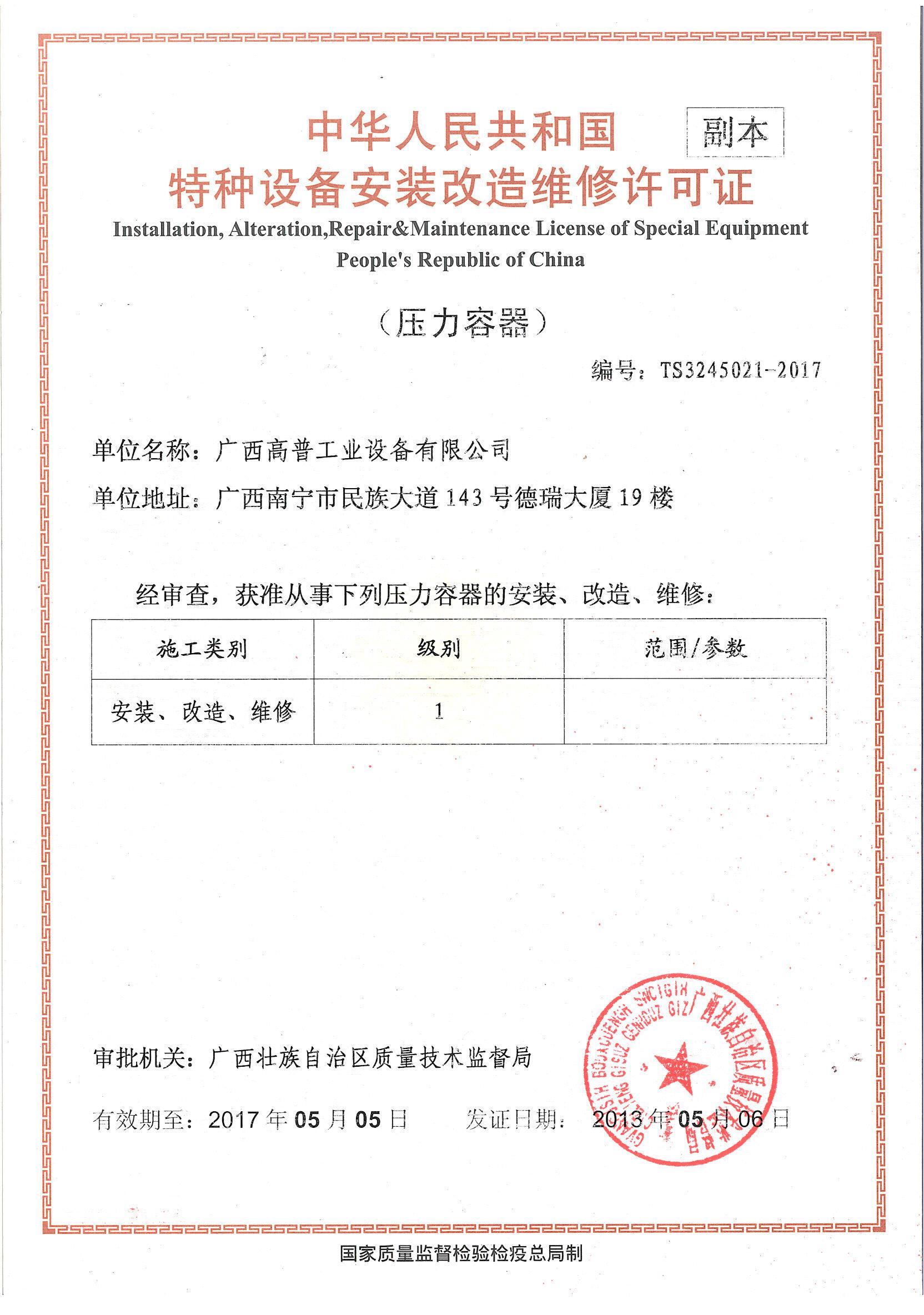 廣西高普工業設備有限公司的前身是南寧高普熱能設備有限公司,是一家成立于1998年,具有獨立企業法人資格的的有限責任公司。公司總部設在廣西首府南寧。在云南、宜賓等多處地方、地區設有辦事及分公司。 本公司是高新技術企業,持有國家技術監督局頒發的1級《特種設備安裝、改造、維修(鍋爐)》許可證,1級許可證是最高級別,可安裝、改造、維修任何形式、參數的鍋爐設備。并持有《壓力管道》安裝、改造維修許可證,1級《壓力容器》安裝、改造、維修,機電設備安裝工程專業承包3級等資質。 公司擁有雄厚的人力資源和技術裝備力量。在現有正式員工中,鍋爐及相關專業工程技術人員55名,其中高級工程師10名,工程師32名。持證焊工55名,持有合格項目七十多項次,項目中包含了一類鋼種和二類鋼種的各種形式的電弧焊及氬弧焊。無損檢測人員11人,Ⅲ級2人,II級9人,項目包括含常規四種探傷方法。機電設備安裝專業工程人員58人,撻有相關專業證書涵蓋40多項專業項目。其中:宜賓分司駐有員工108人,其中工程技術人員23人,高級工程師3人,工程師7人,助理工程師13人,持證焊工20人,II級無損檢測人員5人。 本公司多年專業從事鍋爐設備的安裝、改造、維修工作,擁有多名業內知名的鍋爐專家,有技術過硬的施工隊伍,在制糖行業、造紙、發電行業等領域,有良好的聲譽。..詳細
